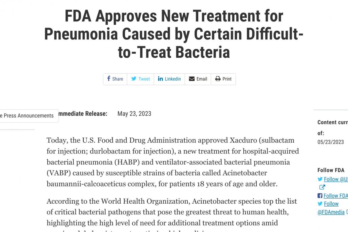 "The FDA is dedicated to supporting the development of safe and effective treatment options for infections caused by difficult-to-treat bacteria like Acinetobacter baumannii-calcoaceticus complex," said Peter Kim, M.D., M.S., director of the Division of Anti-Infectives in the FDA's Center for Drug Evaluation and Research, in a press release on May 23, 2023.