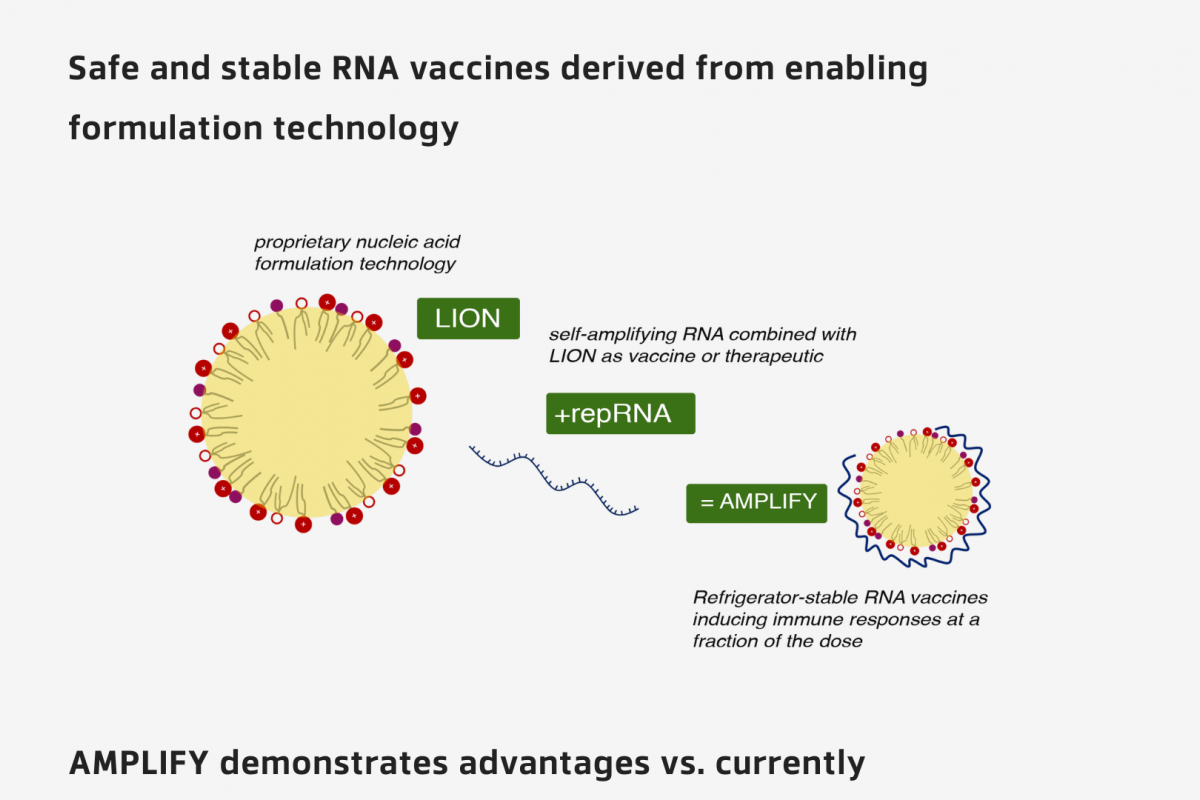 LION is a proprietary nanoemulsion tailored for RNA-based vaccines and therapeutics production designed to enable facile formulation and faster manufacturing compared to the characteristics of standard lipid nanoparticles used in existing vaccine products.