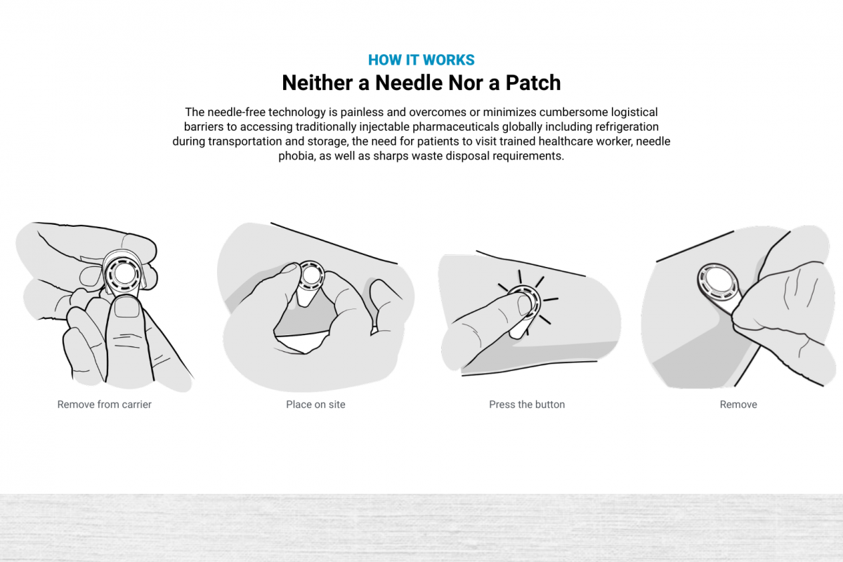 Micron’s technology has been recognized for its potential to have a positive global impact and be game-changing in hard-to-reach settings, such as in Africa. Micron's “peel-and-stick” microarray technology is applied to the skin and allows for the self-administration of pharmaceuticals (vaccines) by pressing a button.