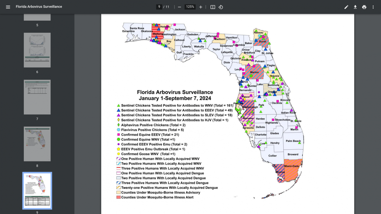 And Duval, Hillsborough, Marion, Miami-Dade, Monroe, and Walton counties are currently under a mosquito-borne illness alert.