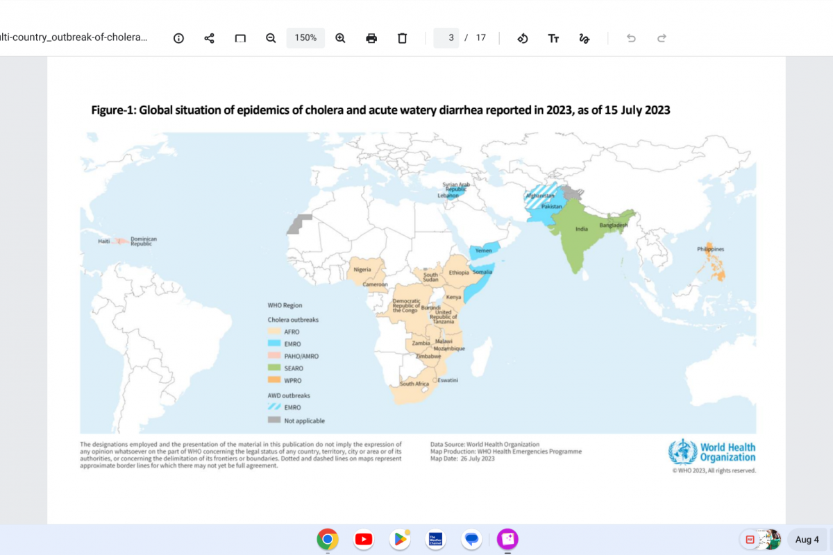 The World Health Organization's (WHO) latest multi-country cholera outbreak situation (#5) says that Based on the large number of outbreaks and their geographic expansion, WHO continues to assess the risk at the global level as very high.