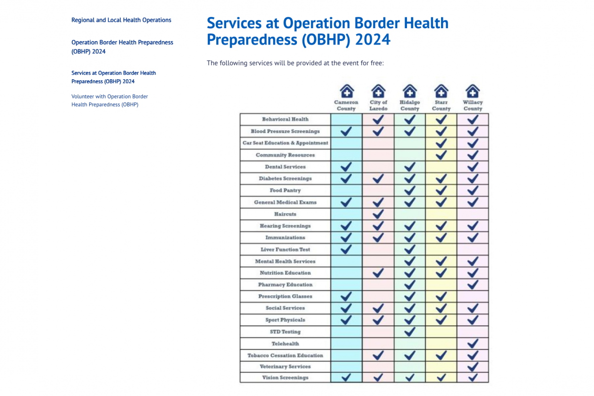 DSHS is partnering with OBHP in 2024 with Hidalgo County Health and Human Services, Cameron County Public Health, Willacy County, Starr County, Laredo Public Health, Texas Military Department, Texas State Guard, Texas A&M University, local nursing schools, and other nonprofit groups.