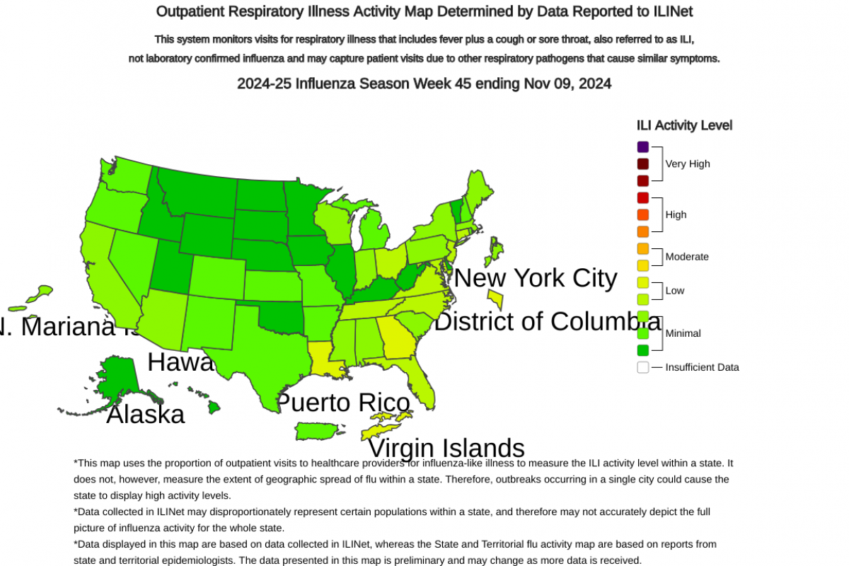 The U.S. Outpatient Influenza-like Illness Surveillance Network monitors outpatient visits for respiratory illnesses. Nationally, during Week #45, 2.5% of patient visits reported to the U.S. CDC were due to respiratory illness, including fever, cough, or sore throat.