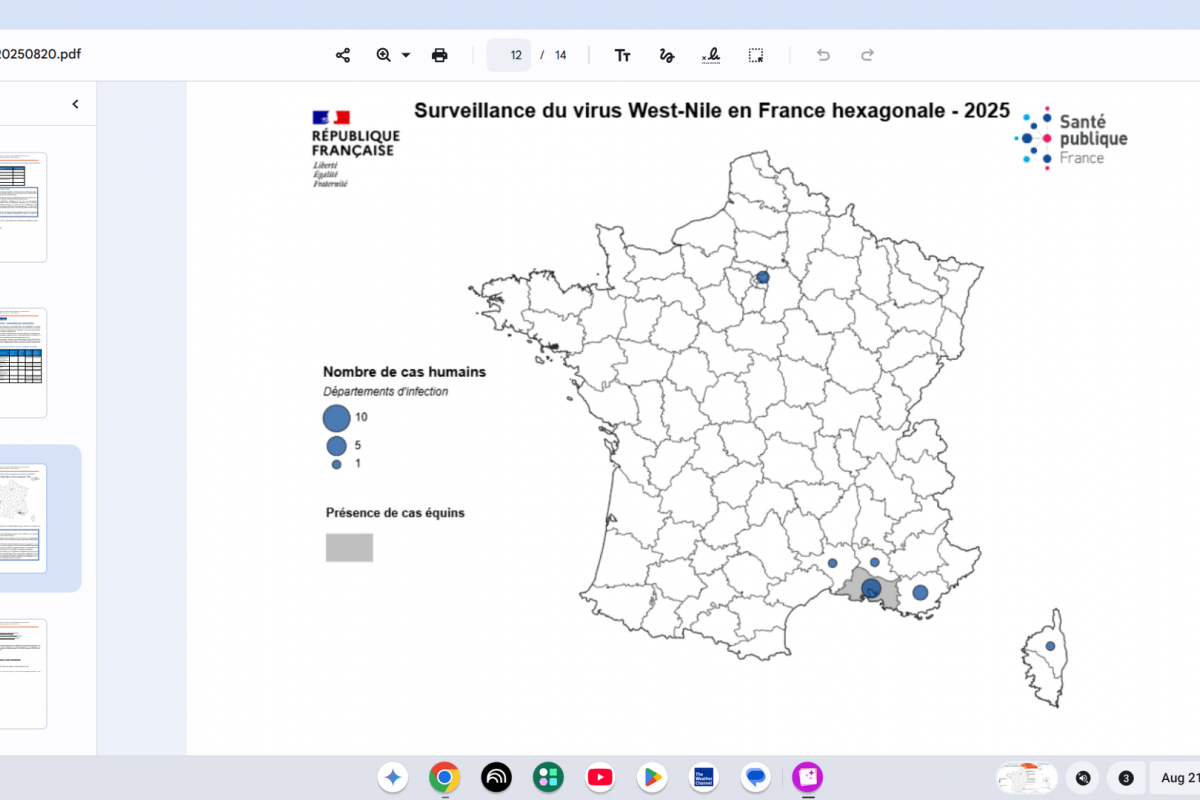 As of August 19, 2025, 13 human cases of vector-borne West Nile virus infection have been identified in six departments of mainland France.