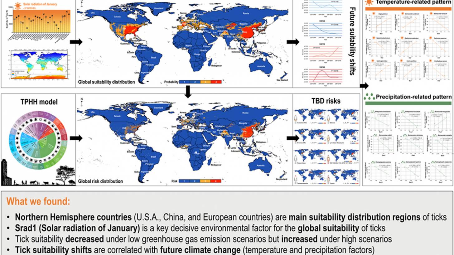 These researchers proposed a "tick-pathogen-habitat-human" model to project the global potential distribution of main pathogenic ticks using a total of 70,714 occurrence records. Specifically, solar radiation in January emerges as the main factor in determining the TBD risk distribution pattern.
