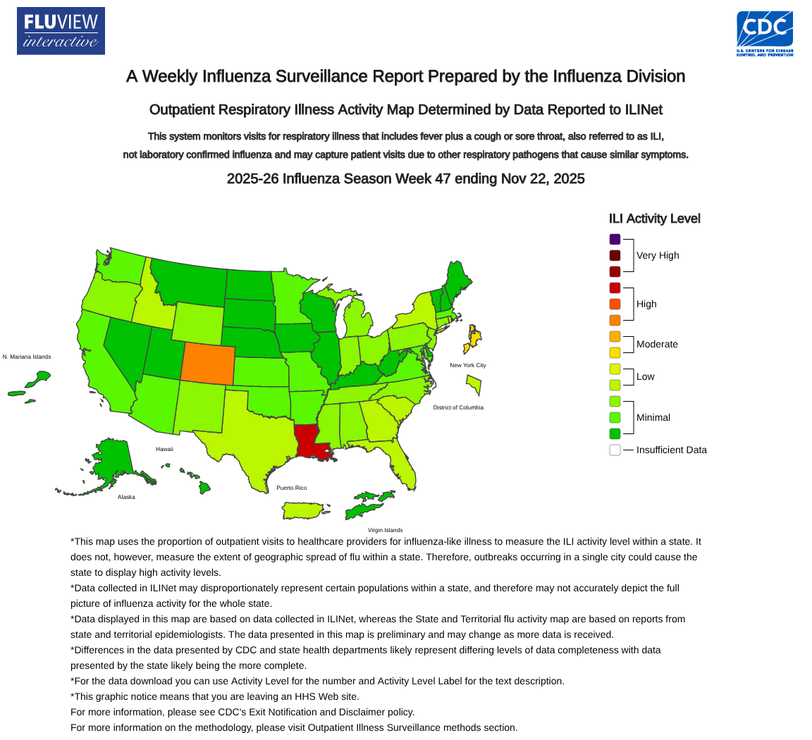 The US CDC's Weekly US Influenza Surveillance Report for Week #47 for 2025 recently offered these insights regarding respiratory disease activity, including Influenza.