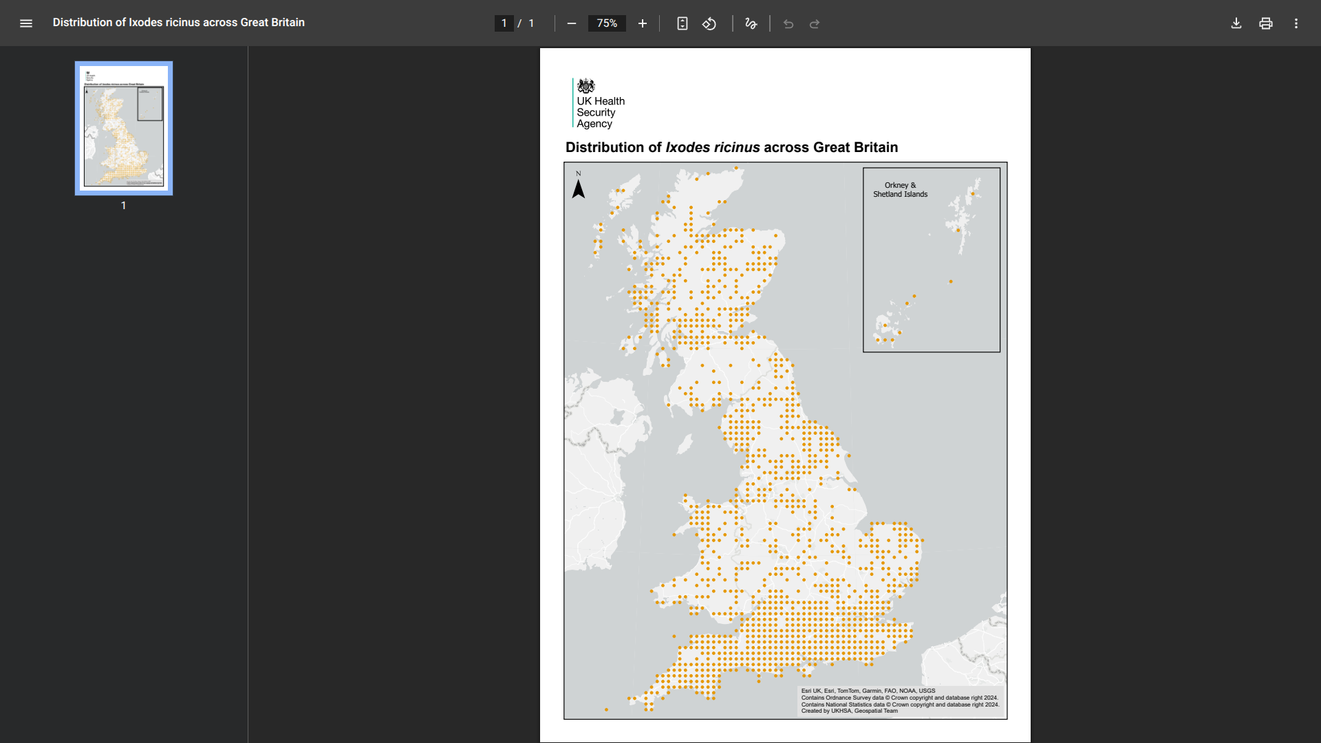 This UKHSA map shows the distribution of the tick Ixodes ricinus across Great Britain. The tick has a wide distribution from southern England up to northern Scotland including the offshore islands of Wales and Scotland.