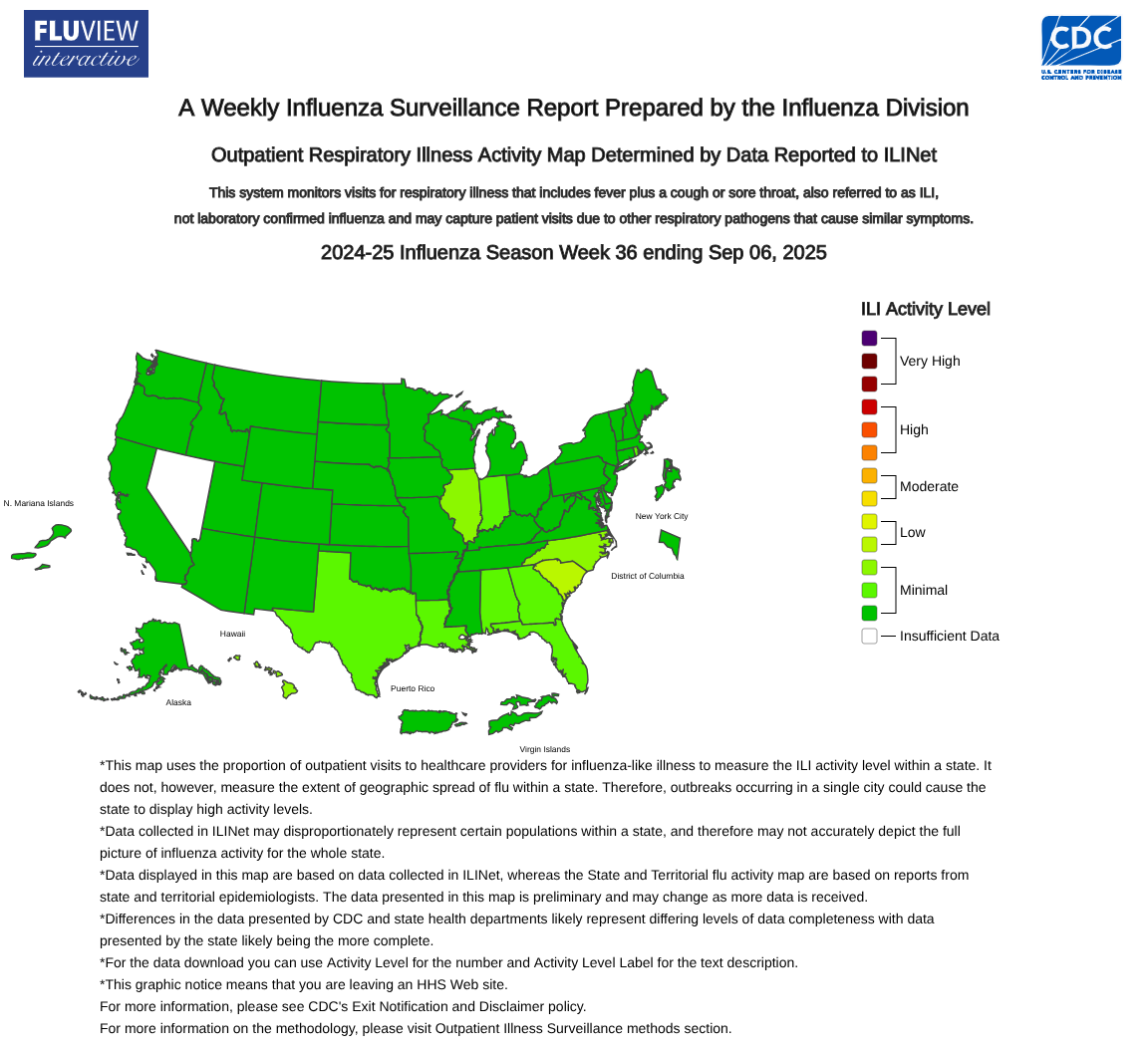 The CDC also confirmed that, based on NCHS mortality surveillance data available as of September 4, 2025, 0.06% of the deaths that occurred during the week ending Week 36 were attributed to influenza.