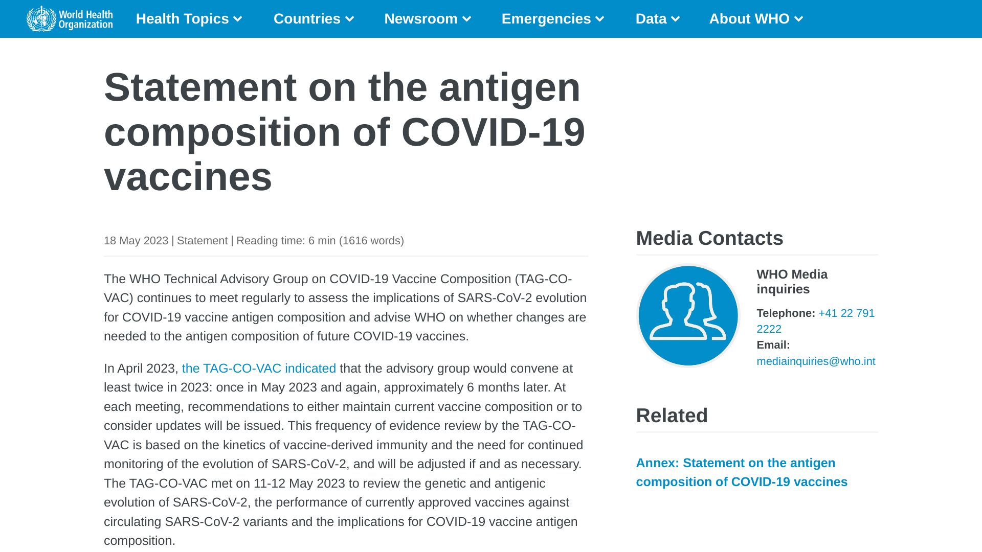 The World Health Organization (CDC) Technical Advisory Group for COVID-19 Vaccine Composition today announced its advice on the composition of future formulations of COVID-19 vaccines.