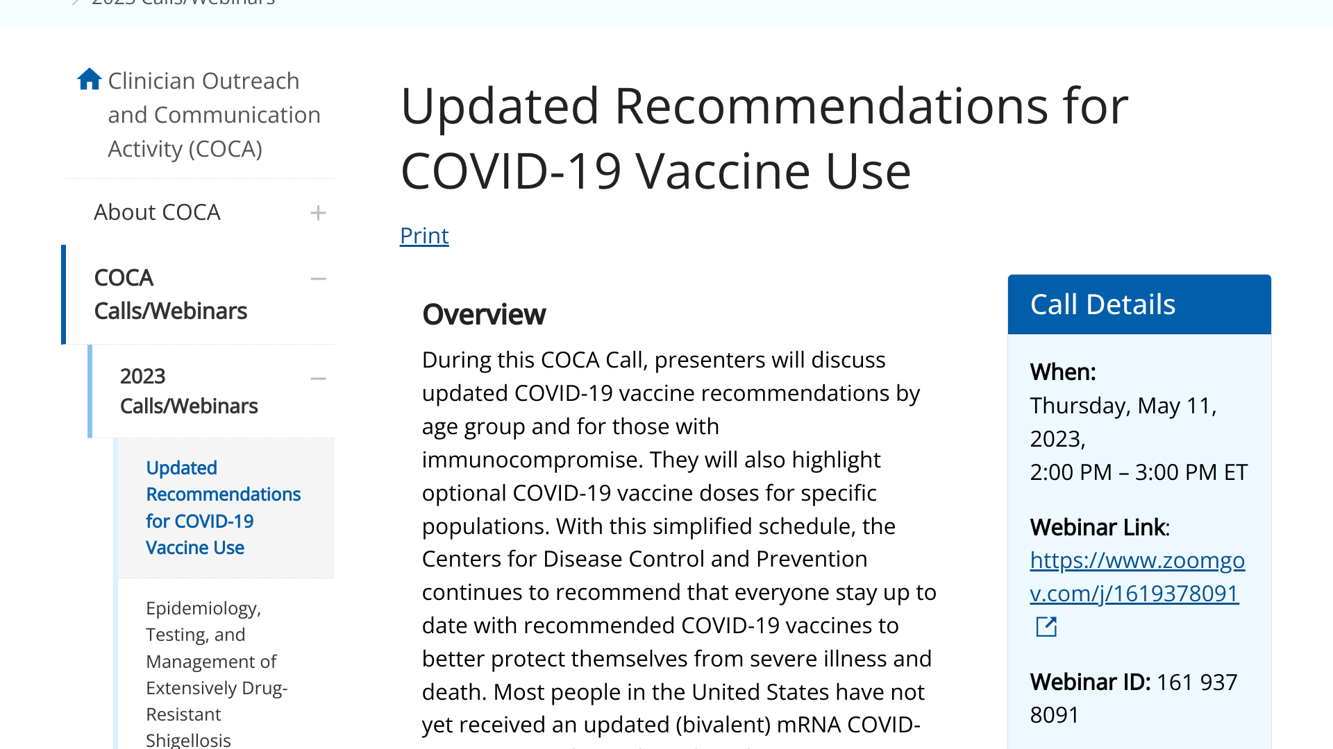 During this COCA Call on May 11, 2023, presenters will discuss updated COVID-19 vaccine recommendations by age group and for those with immunocompromise.