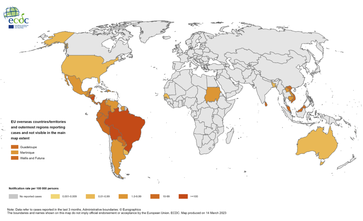 The U.S. CDC published provisional data as of May 5, 2023, indicating the U.S. States, led by Florida, have reported 98 dengue cases in 2023, and U.S. Territories have confirmed 238 dengue cases this year.