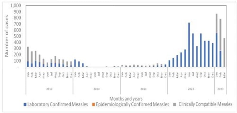 In 2022, a total of 4,845 laboratory-confirmed measles cases and six deaths were reported across 32 of the 38 provinces.