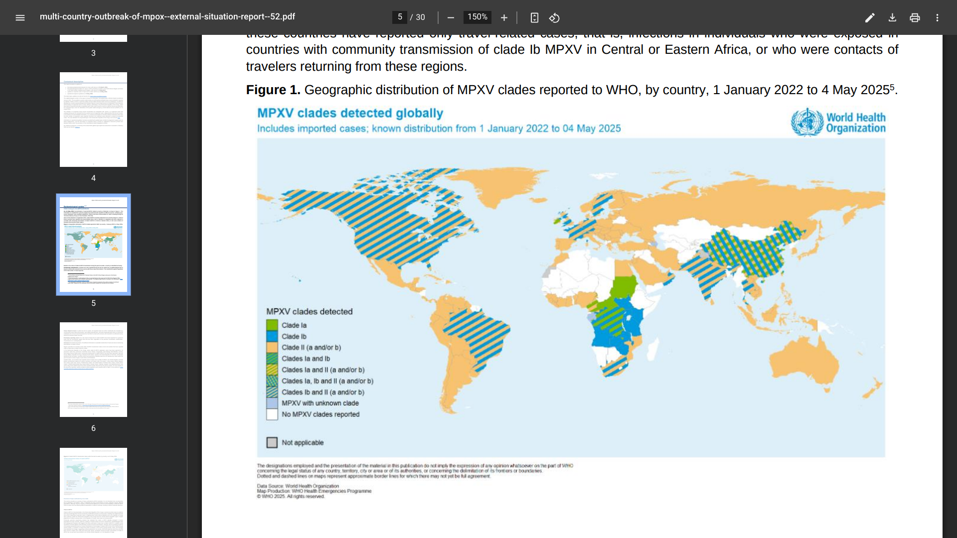 Outside Africa, 16 countries have reported travel-related cases of mpox due to clade Ib: the United Kingdom of Great Britain and Northern Ireland (12 cases), Germany (10 cases), China (seven cases), Belgium (five cases), Qatar (five cases), Thailand (five cases), the United States of America (four cases).