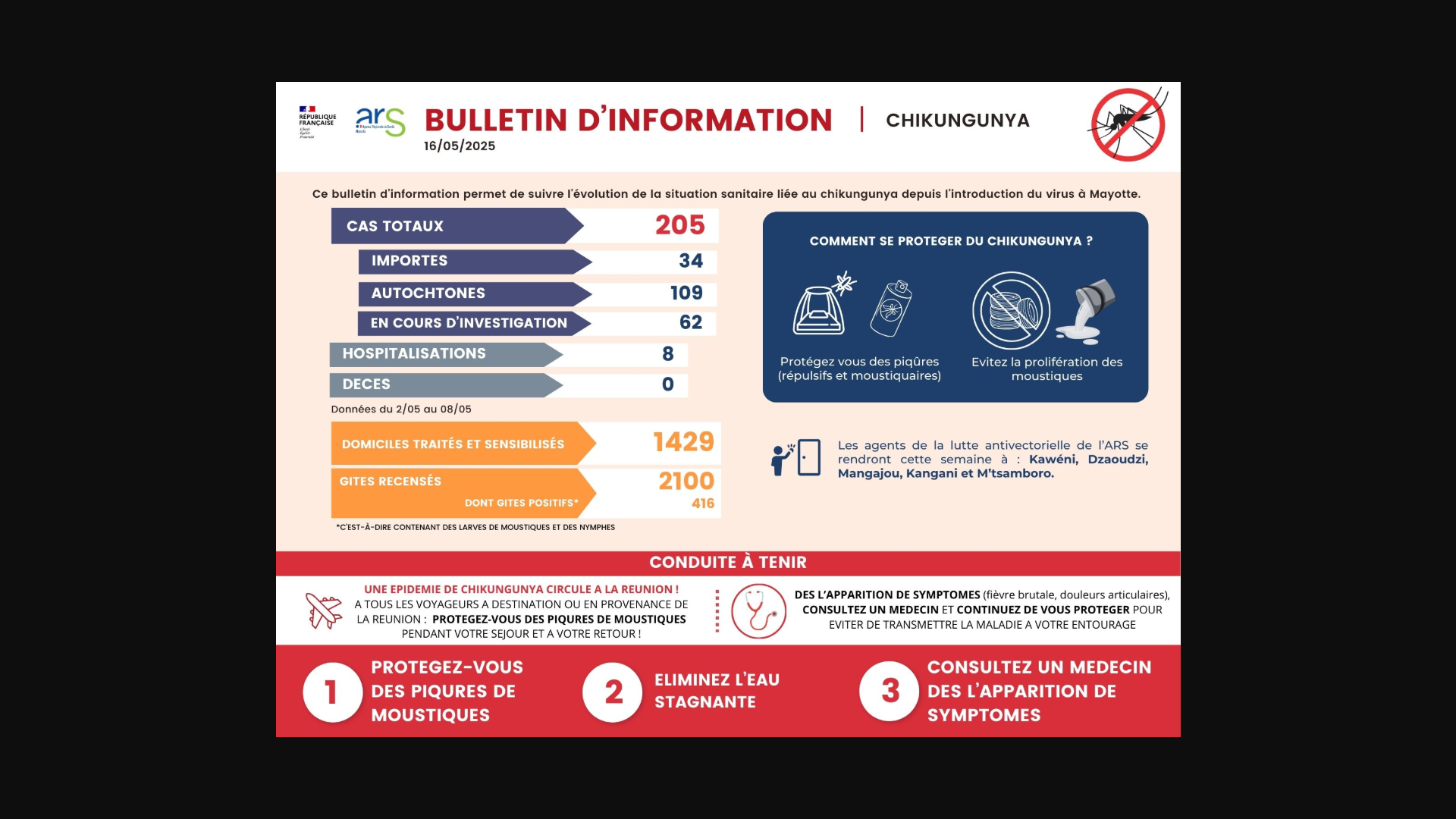 As of May 16, 2025, Regional Health Agency (ARS) Mayotte reported 205 confirmed Chikungunya cases, including 34 imported cases, 109 locally acquired cases, and 62 cases currently under investigation.