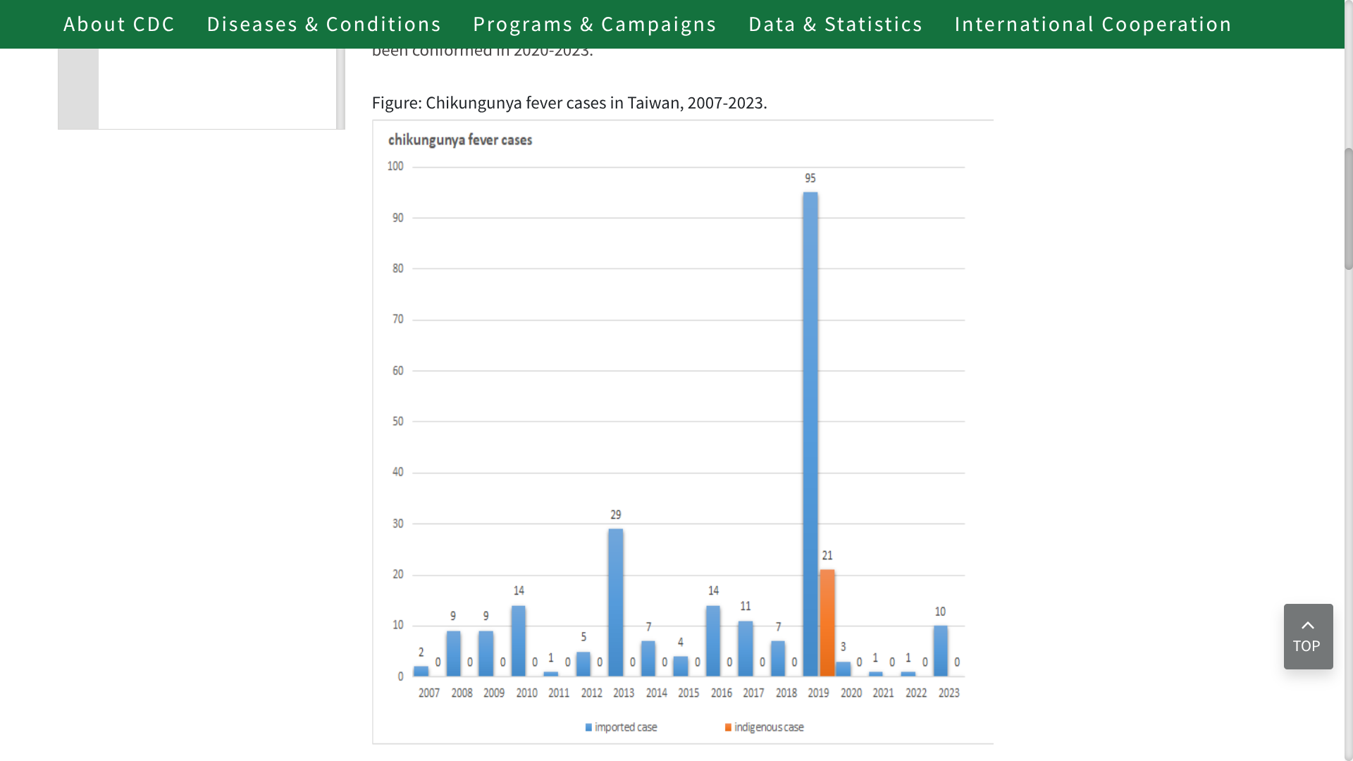 Since Chikungunya was listed as a notifiable infectious disease by the Taiwan Centers for Disease Control (TCDC) in October 2007, a few travel-related and locally acquired cases have been reported most years.