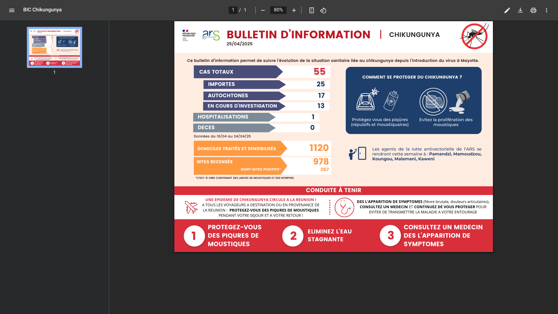 Following the identification of the first indigenous (local) Chikungunya case on Mayotte, the Regional Health Agency activated level 2A of the ORSEC plan on March 26, 2025.