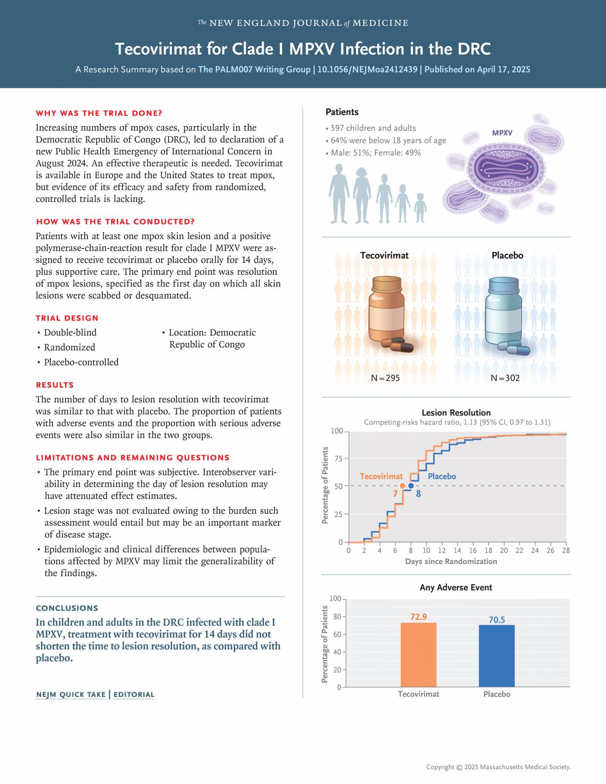 Published by the New England Journal of Medicine on April 16, 2025, these researchers determined that tecovirimat did not reduce the number of days to lesion resolution in patients in the DRC with mpox caused by clade I MPXV.