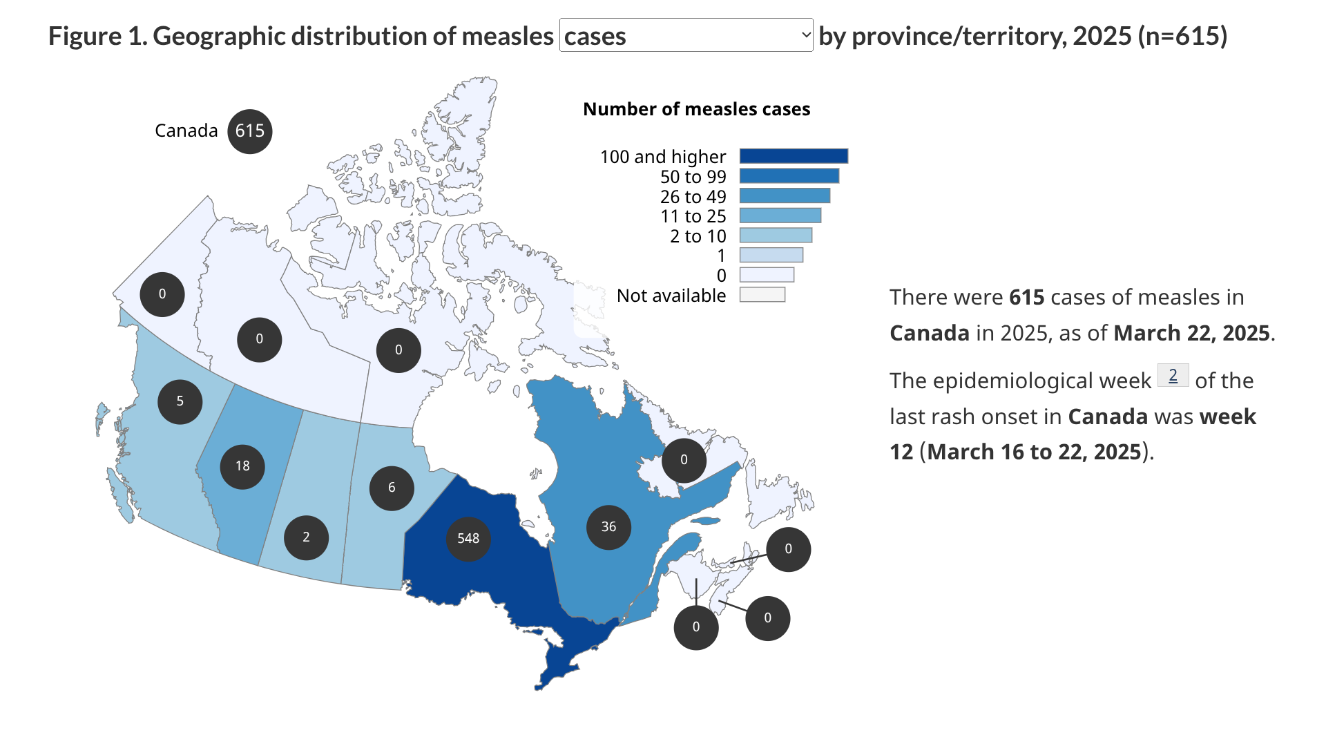 As of March 22, 2025, six jurisdictions (Alberta, British Columbia, Manitoba, Ontario (548), Quebec, Saskatchewan) in Canada had reported 615 measles cases.