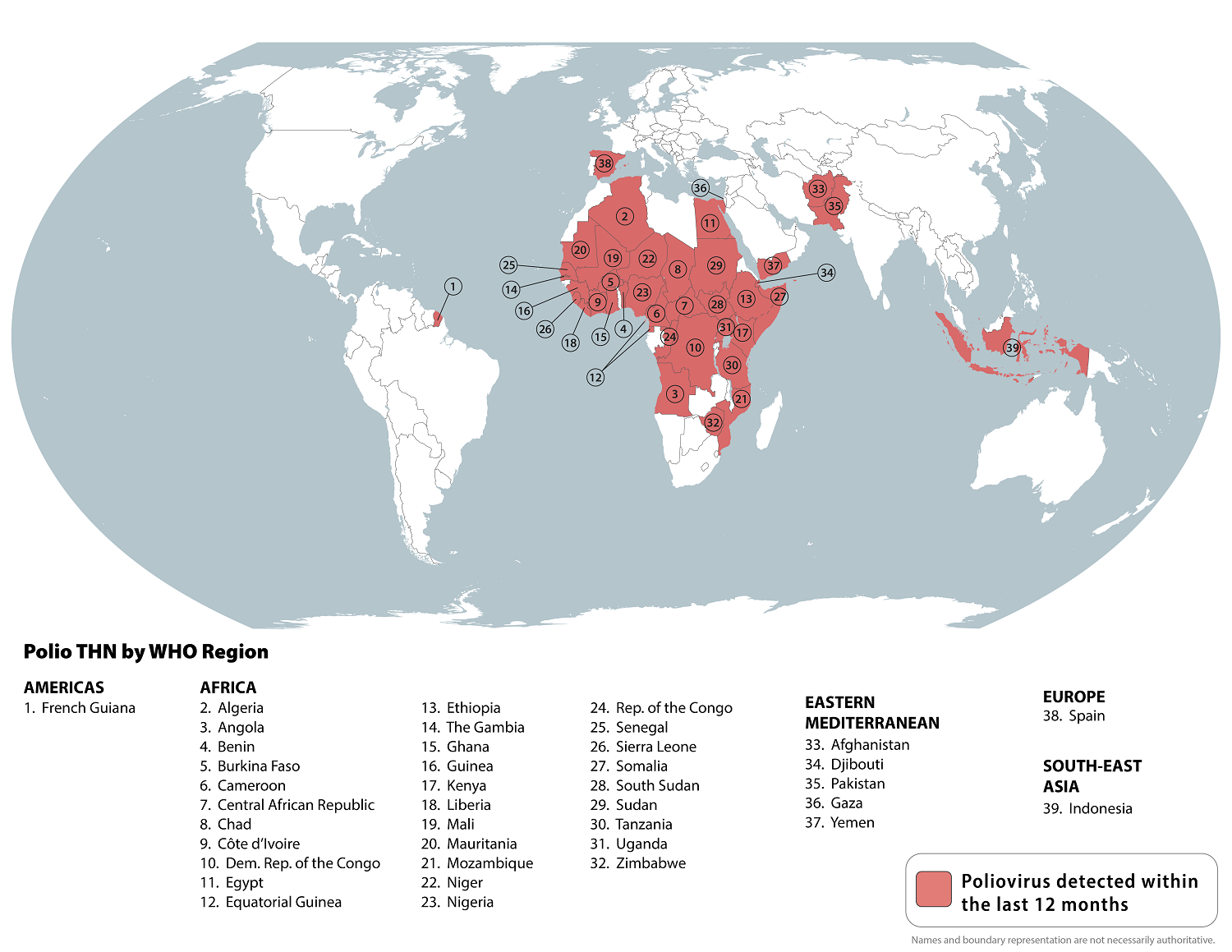 As of April 11, 2025, the U.S. CDC maintains a Global Measles Outbreak Travel Health Advisory that identifies 39 countries at risk for the spread of poliovirus.