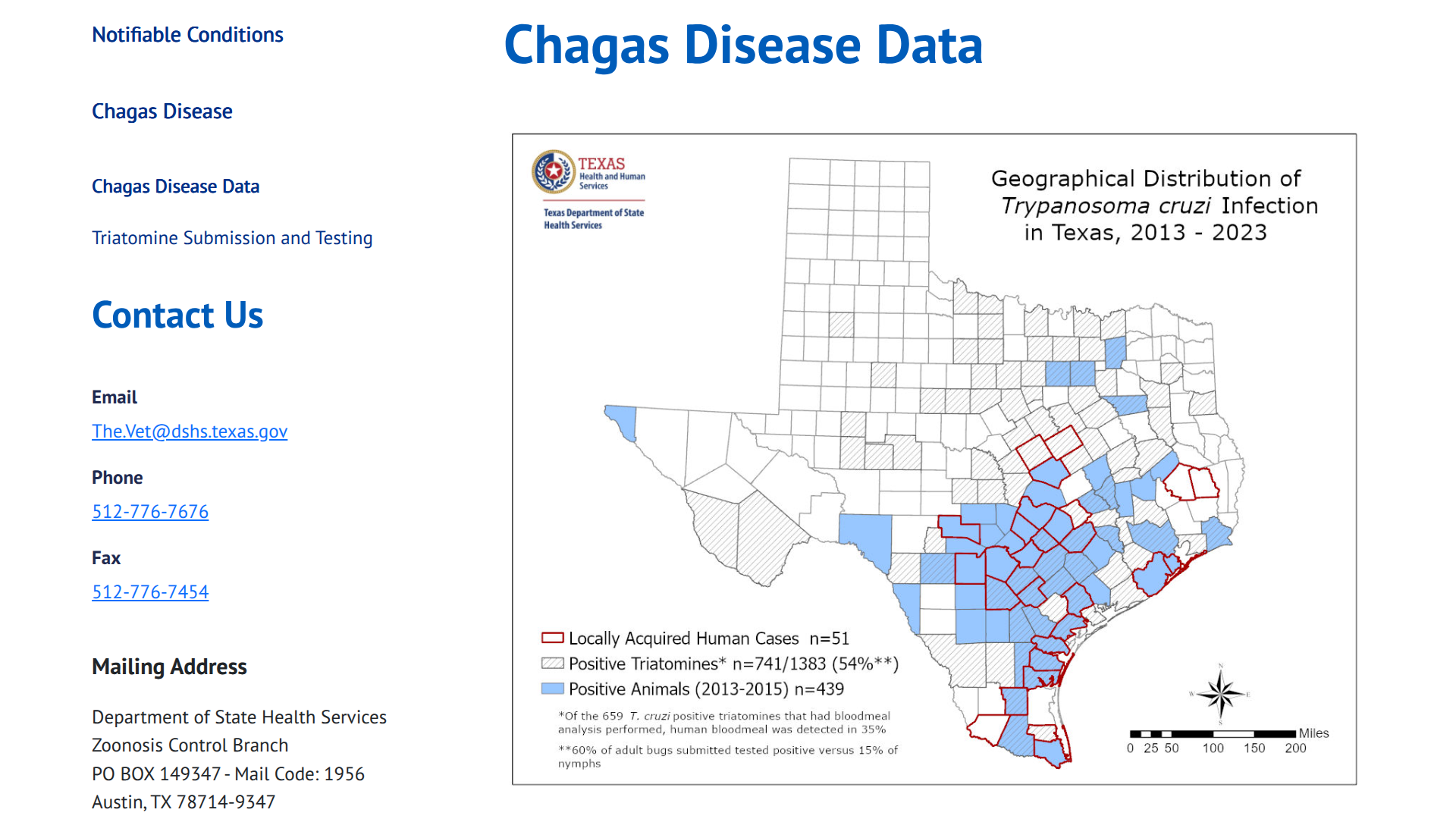 The state of Texas has undertaken extensive efforts to document human Chagas disease cases that were made reportable in 2013. The first known autochthonous case of human Chagas disease in the U.S. occurred in an infant in Corpus Christi, Texas, in 1955, in a home infested with triatomines.