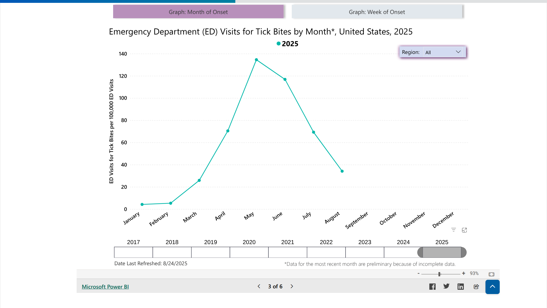 As of September 2025, the U.S. Centers for Disease Control and Prevention's Tick Bite Data Tracker displays case data and maps for the U.S.