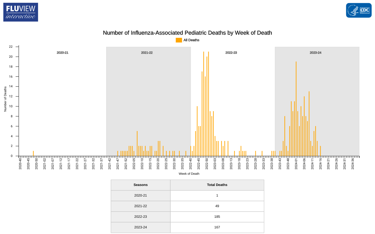 As of May 17, 2024, the CDC reported three additional influenza-associated pediatric deaths during Week #19, bringing the total number of pediatric deaths for this season to 167.