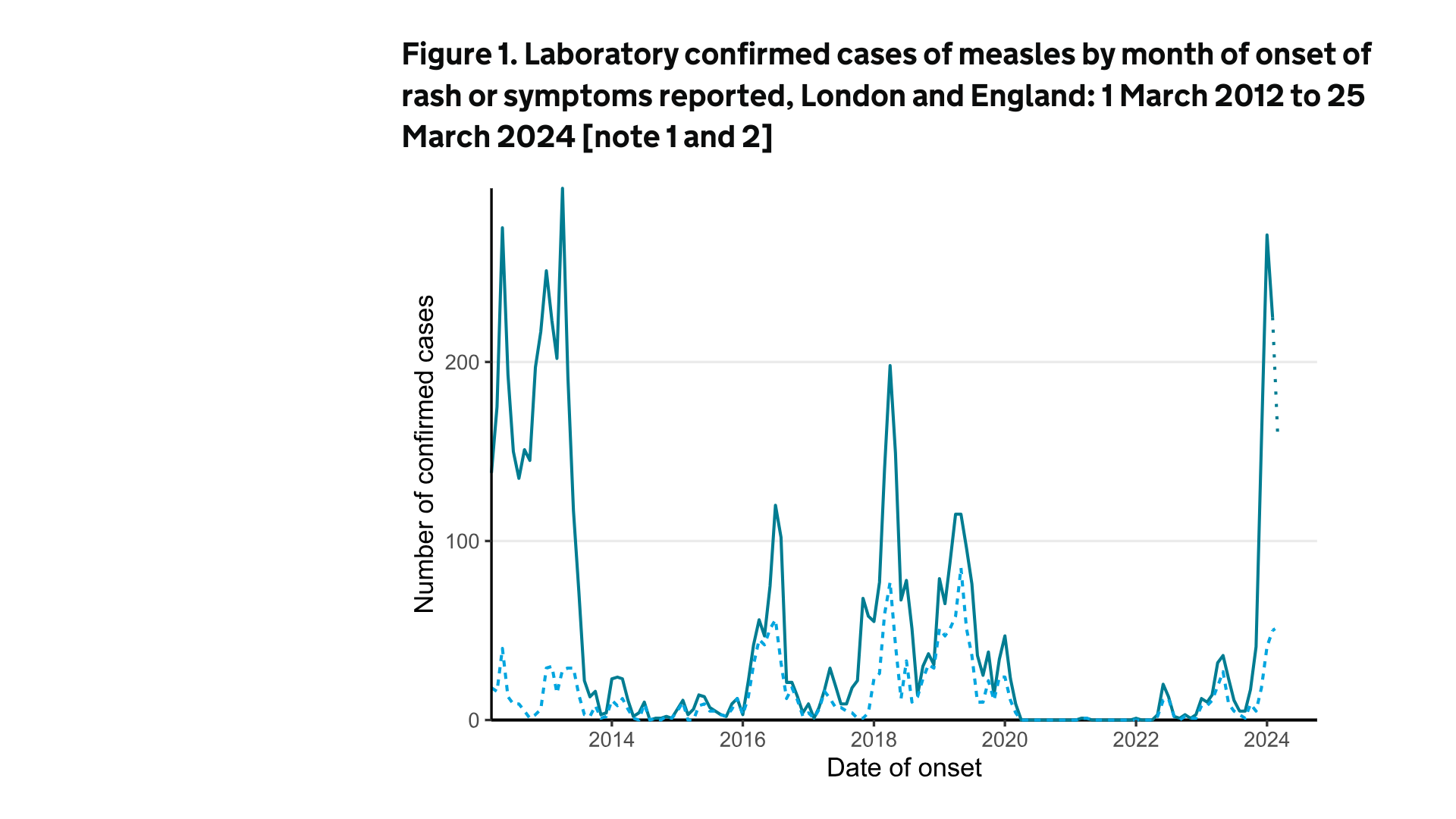 The U.K. Health Security Agency (UKHSA) reported data from October 2023: 868 laboratory-confirmed measles cases had been reported in England as of March 28, 2024.