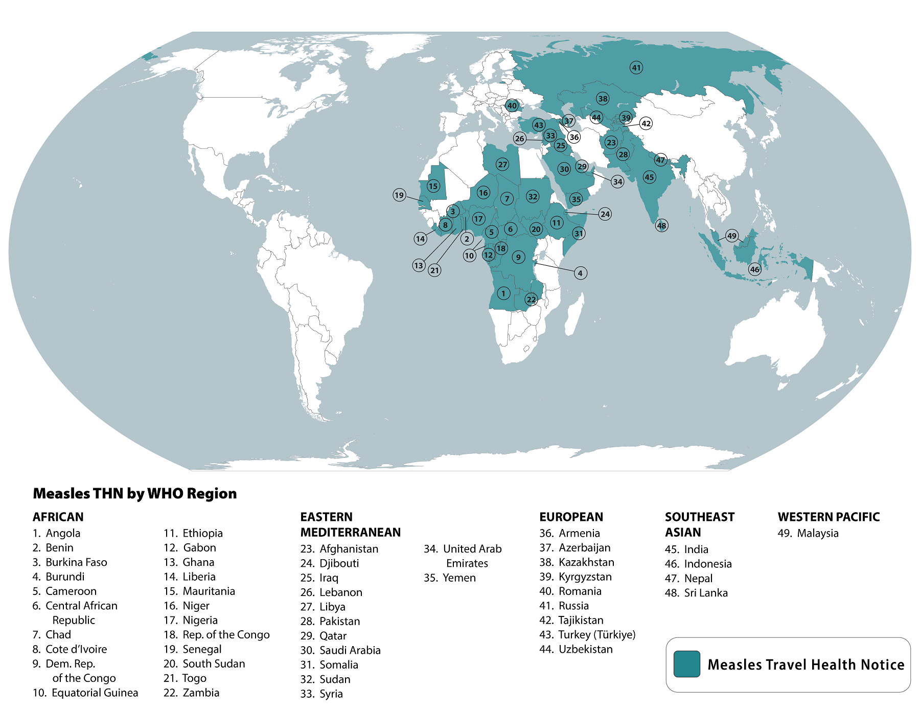 On March 22, 2024, the U.S. CDC updated its global measles travel advisory, listing 49 countries. Measles spreads rapidly and may become a risk to travelers in places not included on the list above.