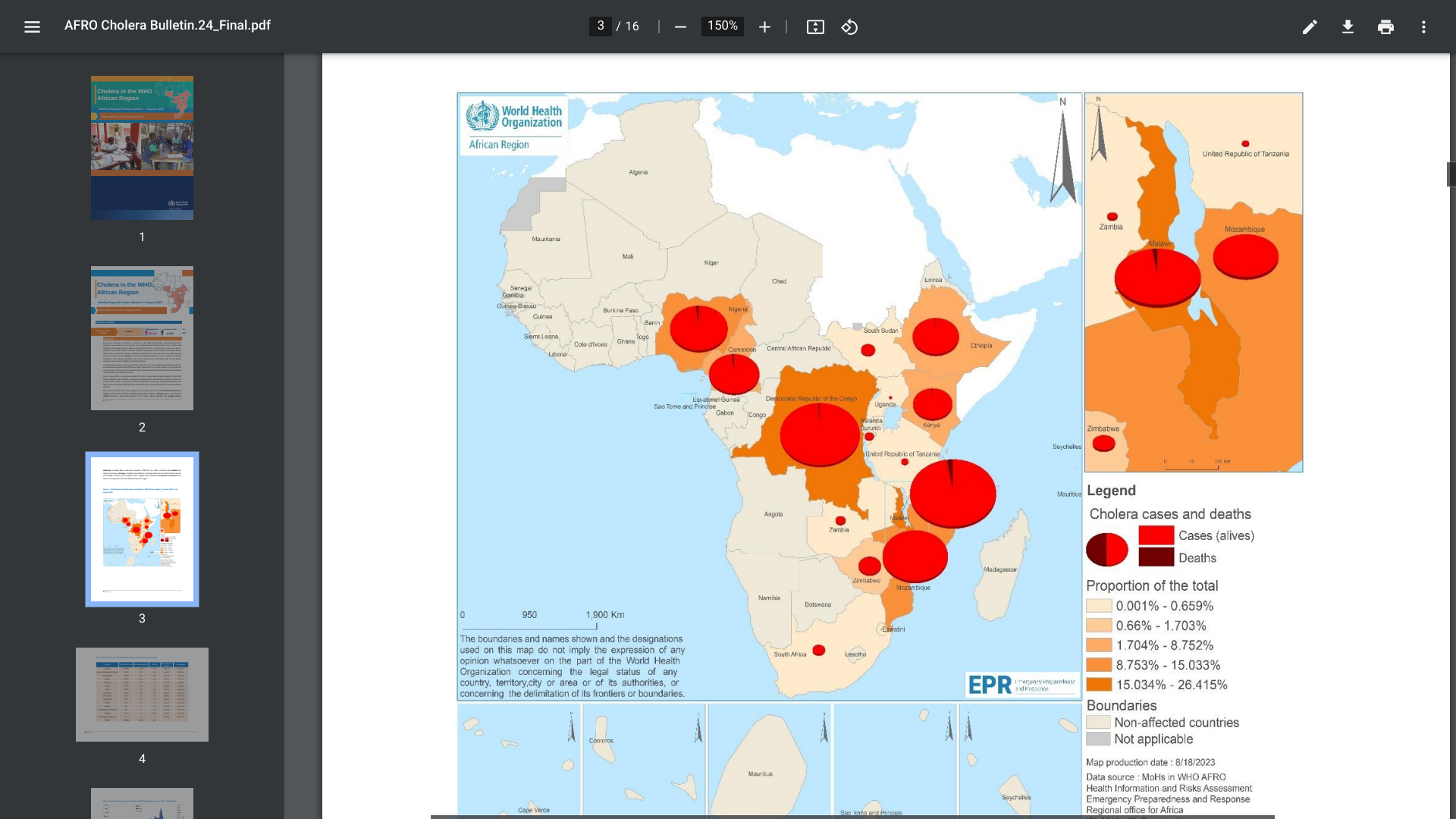 Since January 2022, a cumulative number of 223,951 cholera cases has been reported to the WHO, including 4,125 deaths, with a case-fatality ratio of 1.8% as of early August 2023.