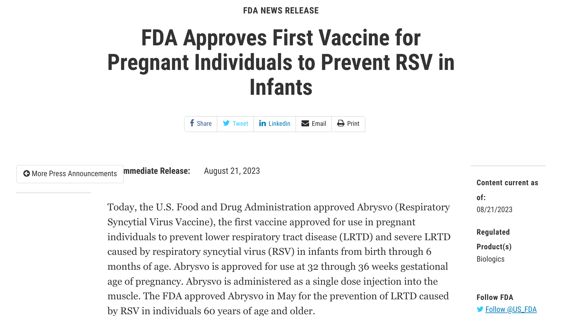 The U.S. Food and Drug Administration (FDA) today approved ABRYSVO™, the first vaccine approved for use in pregnant women to prevent lower respiratory tract disease (LRTD) and severe LRTD caused by respiratory syncytial virus (RSV) in infants from birth through six months of age.