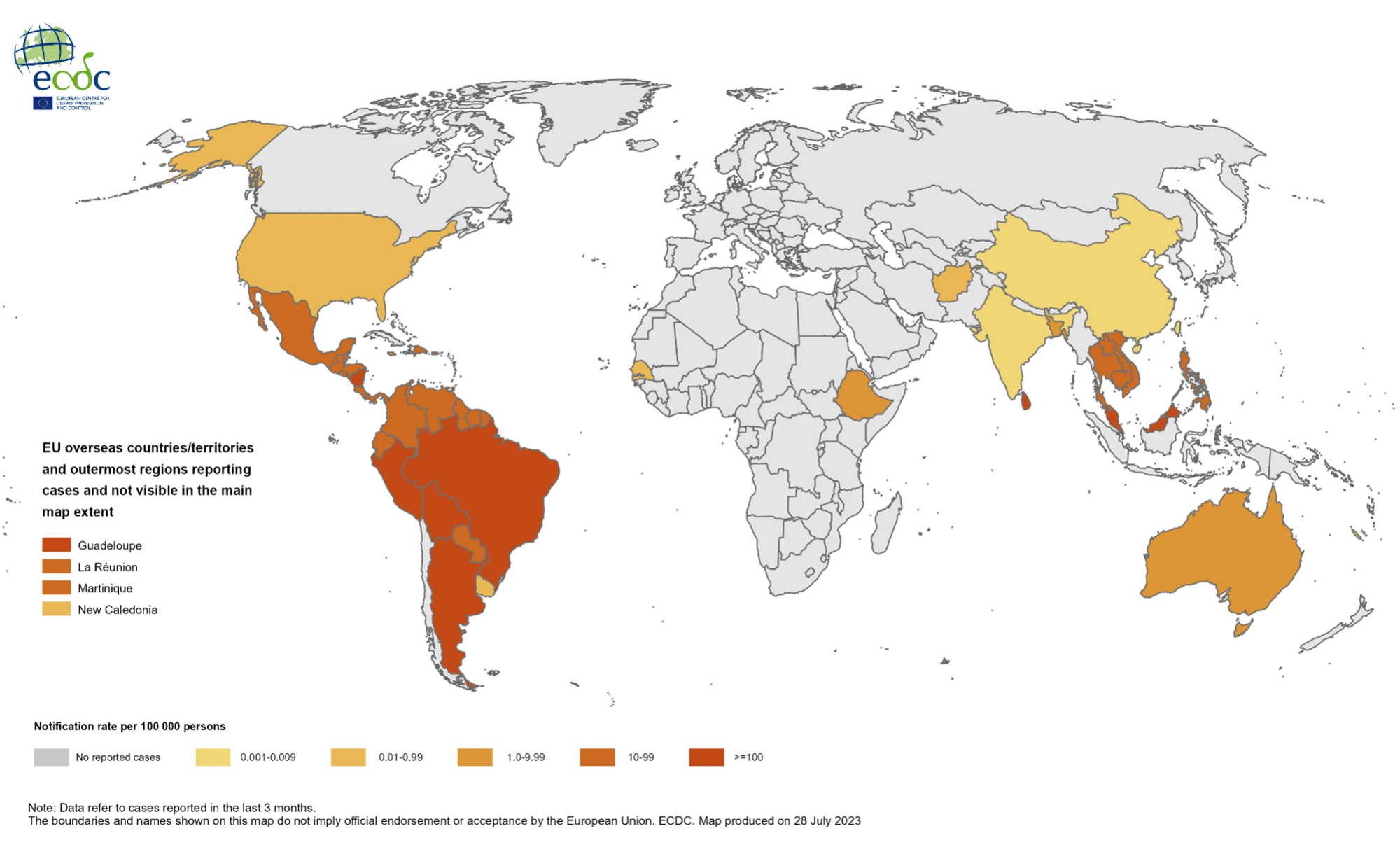In the U.S., Florida has reported both locally-acquired and travel-related dengue cases in 2023.