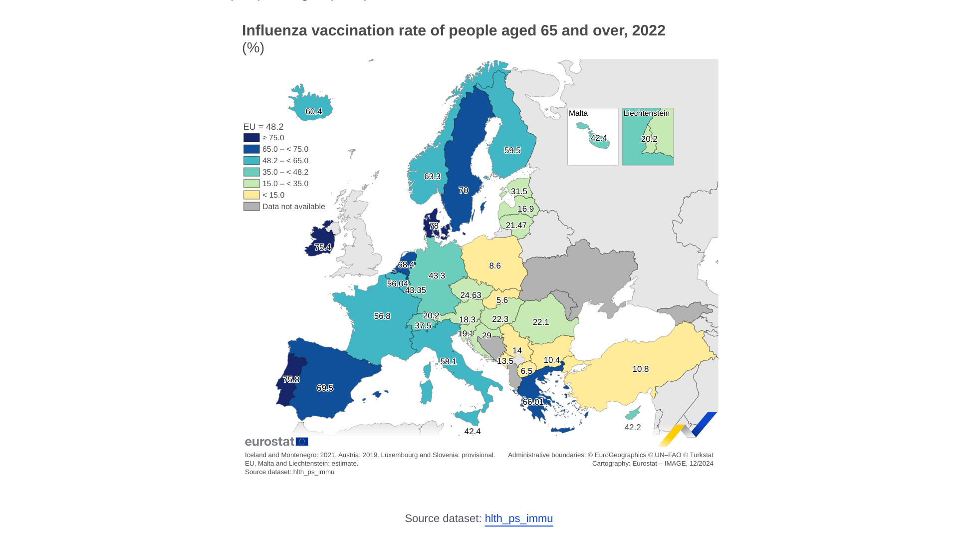Eurostat reported on December 16, 2024, that 48.2% of individuals aged 65 or over in the EU were vaccinated against influenza in 2022.
