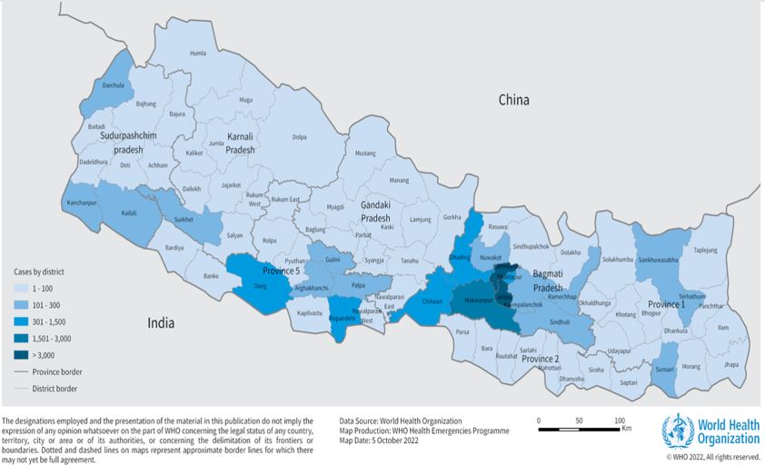 In 2022, the WHO confirmed 28,109 suspected and confirmed cases of dengue fever, including 38 confirmed deaths (CFR 0.13%), were reported from all seven provinces of Nepal, affecting all 77 districts.