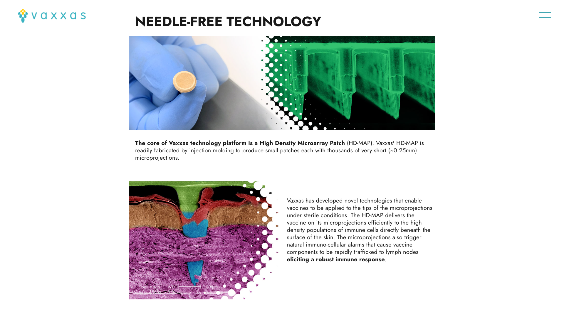 The Vaxxas HD-MAP comprises thousands of microscopic projections molded into a small patch. Each microprojection is coated with a small dose of vaccine in a dried formulation. When applied to the skin using a proprietary applicator, the patch delivers the vaccine to the abundant immune cells that naturally reside immediately below the skin surface.