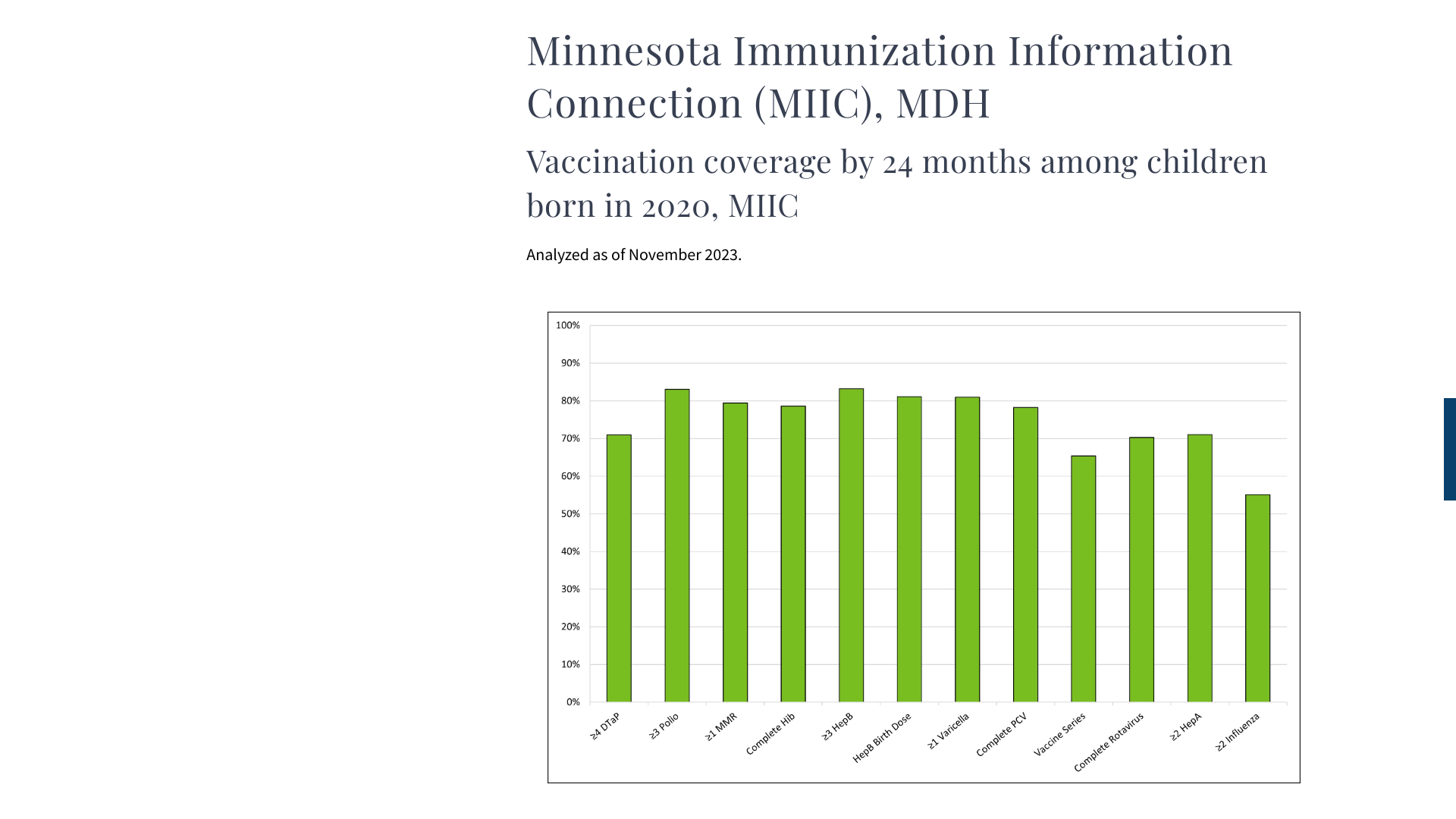 According to MDH data, about 80% of young children were vaccinated with a measles vaccine as of November 2023. MDH reported (0) measles cases in 2023, but 22 in 2022.