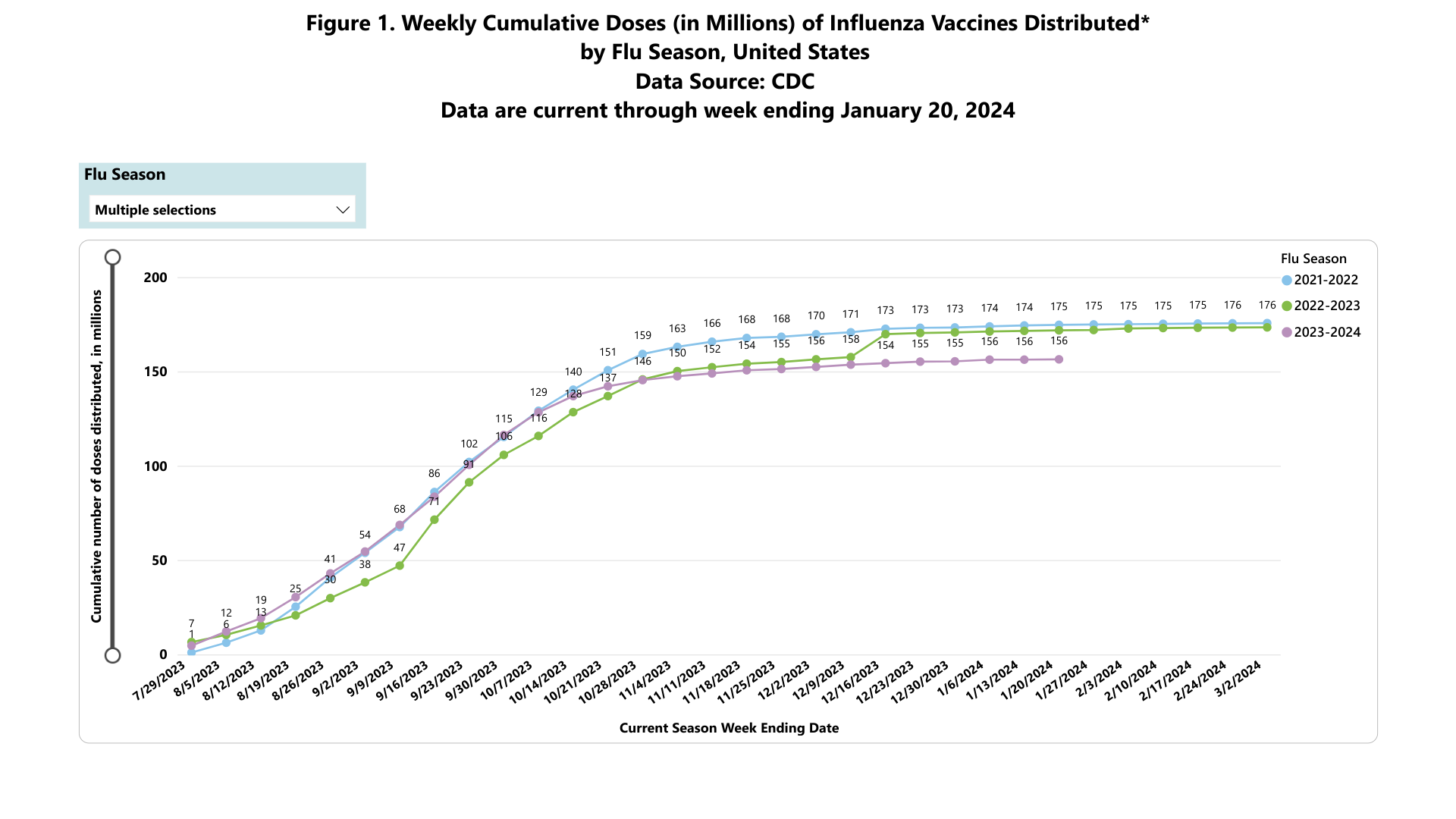 As of January 20, 2024, the CDC's data indicates about 156 million influenza vaccines have been distributed during the 2023-2024 season. However, this data may change as the flu season progresses.