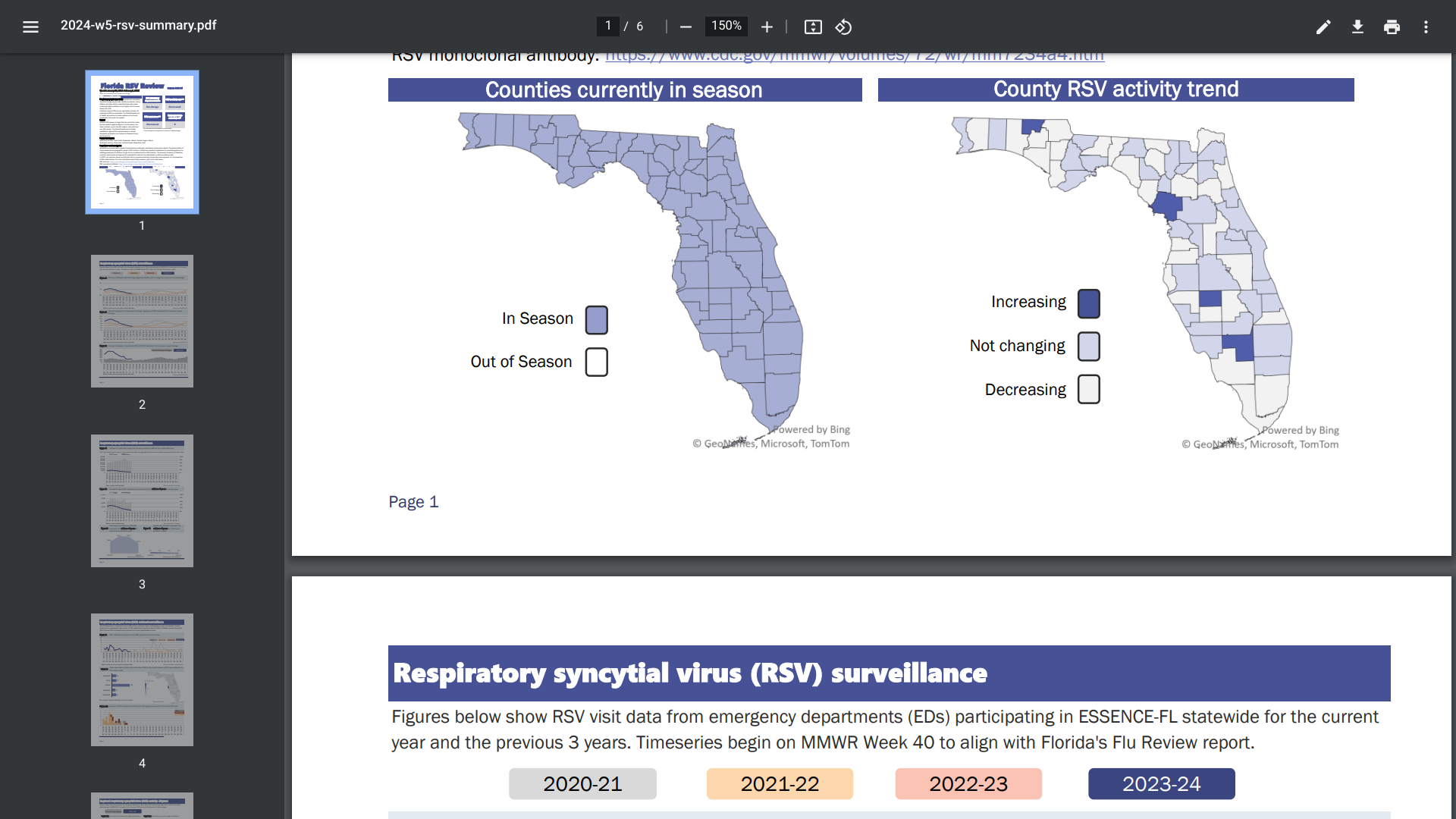 In the U.S., the Centers for Disease Control and Prevention's RSV detection graphs display the 5-week moving average, recently indicating decreased cases in certain states.