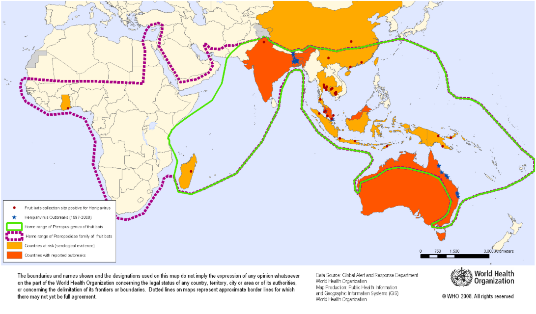 According to the WHO, fruit bats carry the disease and may also be transmitted by contact with infected animals (pigs) or from person to person via close contact.