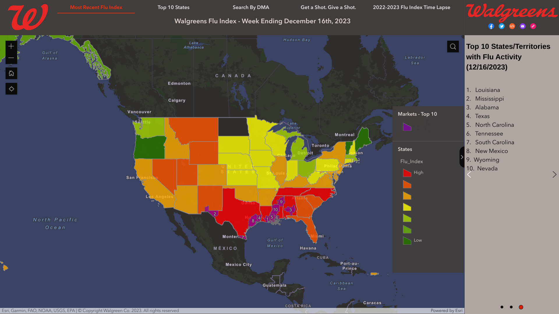 As of late December 2023, the U.S. Centers for Disease Control and Prevention (CDC) and Walgreens published updated maps and data identifying where influenza is being detected.