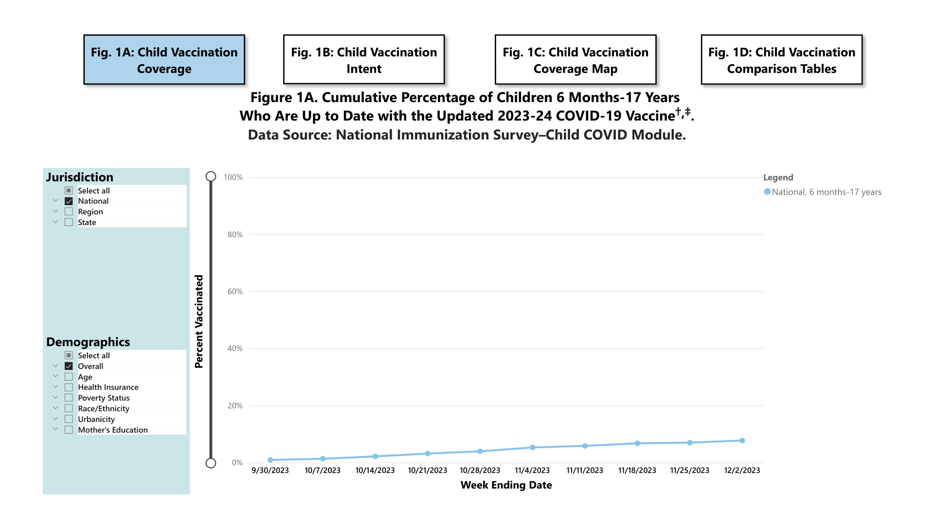 As of December 2, 2023, 7.7% (95% Confidence Interval: 6.5%-8.9%) of children (six months to 17 years) were reported to be up to date with the 2023-24 COVID-19 vaccine. An additional 18.6% (15.9%-21.3%) of children had a parent who said they planned to get their child vaccinated.