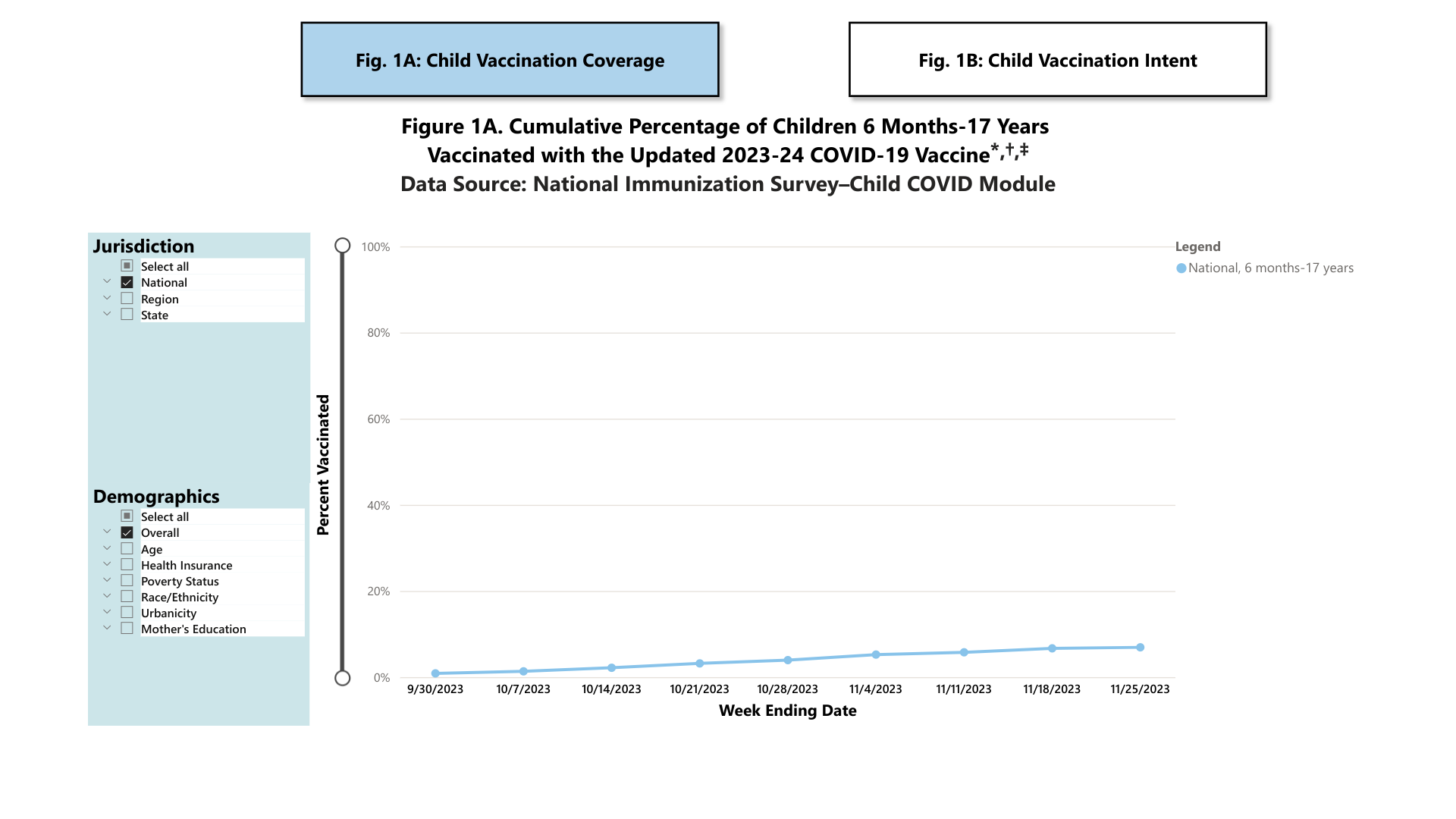 And for adults, about 16% reported having received an updated 2023-24 COVID-19 vaccine since September 14, 2023. Vaccination coverage increased by age and was highest among adults 65 and older [33.3%, (31.2%-35.3%)].