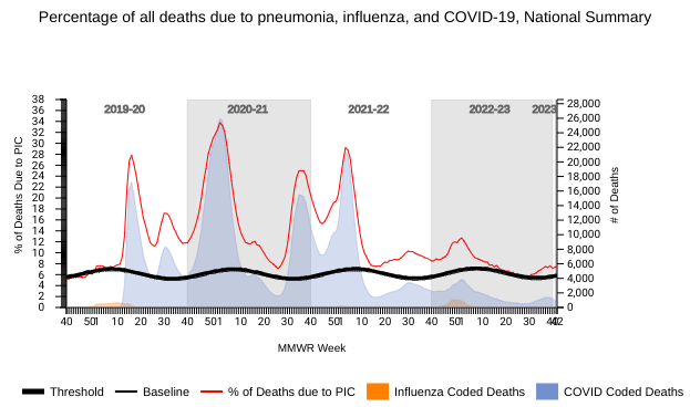During week #42, the NCHS reported 1,379 pneumonia deaths, compared with 637 COVID-19 and 20 influenza.