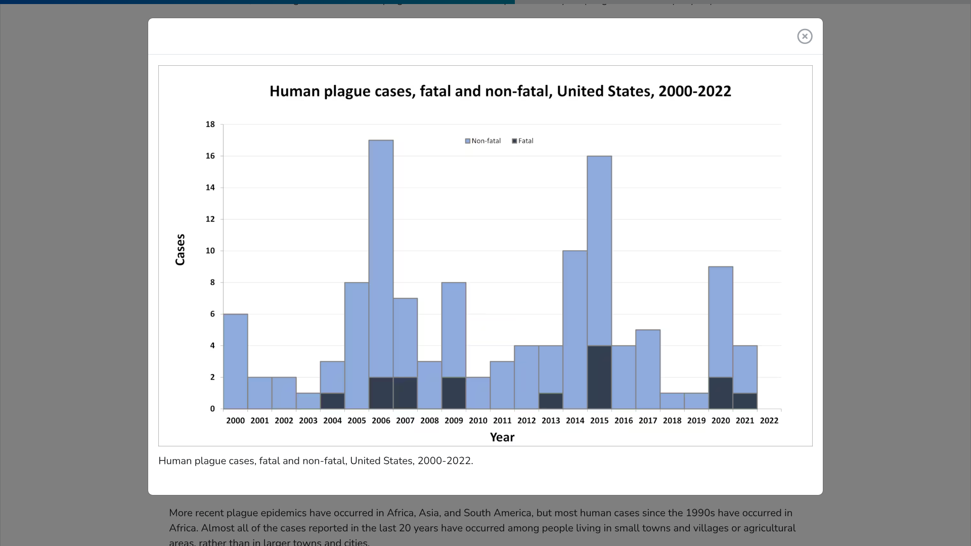 Since the mid–20th century, plagues in the United States have typically occurred in the rural West. The CDC says cases in the eastern United States are among people who traveled from the west or have laboratory exposure.