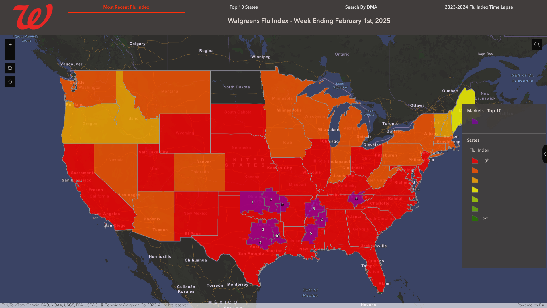 From a geographic perspective, the Walgreens Flu Index has identified its leading markets for influenza-related activity. As of February 1, 2025, the leading Designated Market Areas with flu activity were: