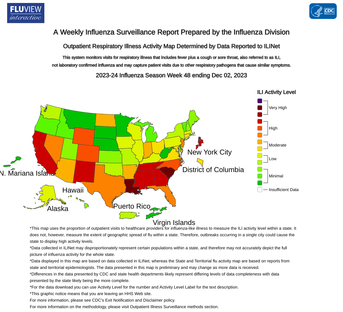 Furthermore, the National Center for Health Statistics (NCHS) Mortality Surveillance data available on December 7, 2023, indicates that 0.2% of the deaths (48) that occurred during Week #48 were due to influenza.
