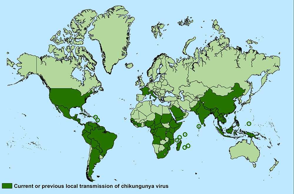 High-risk areas of infection are places where chikungunya virus-carrying mosquitos are currently endemic, including the Americas, parts of Africa, and Southeast Asia.