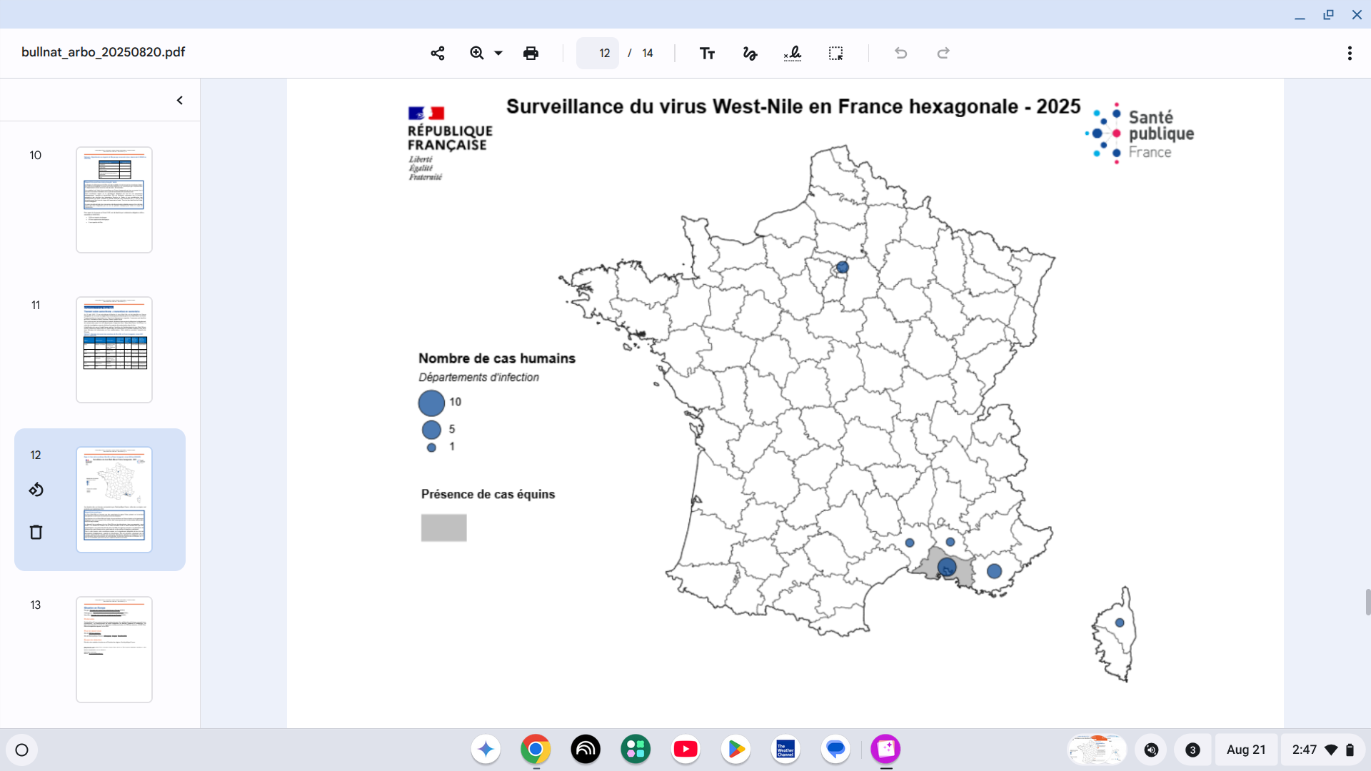 As of August 19, 2025, 13 human cases of vector-borne West Nile virus infection have been identified in six departments of mainland France.