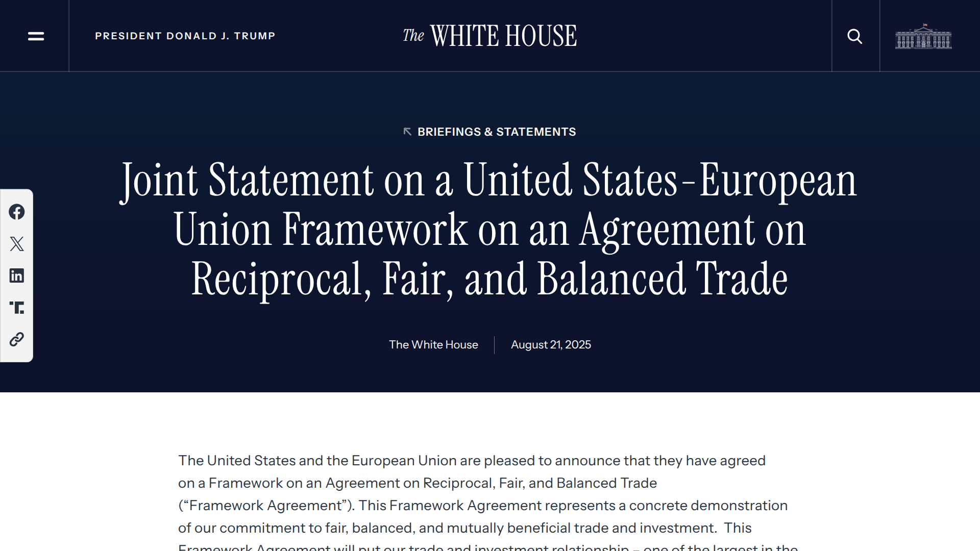 The European Union (EU) and the United States government have announced the details of a Framework on an Agreement on Reciprocal, Fair, and Balanced Trade (Framework Agreement), which includes pharmaceutical products such as vaccines.