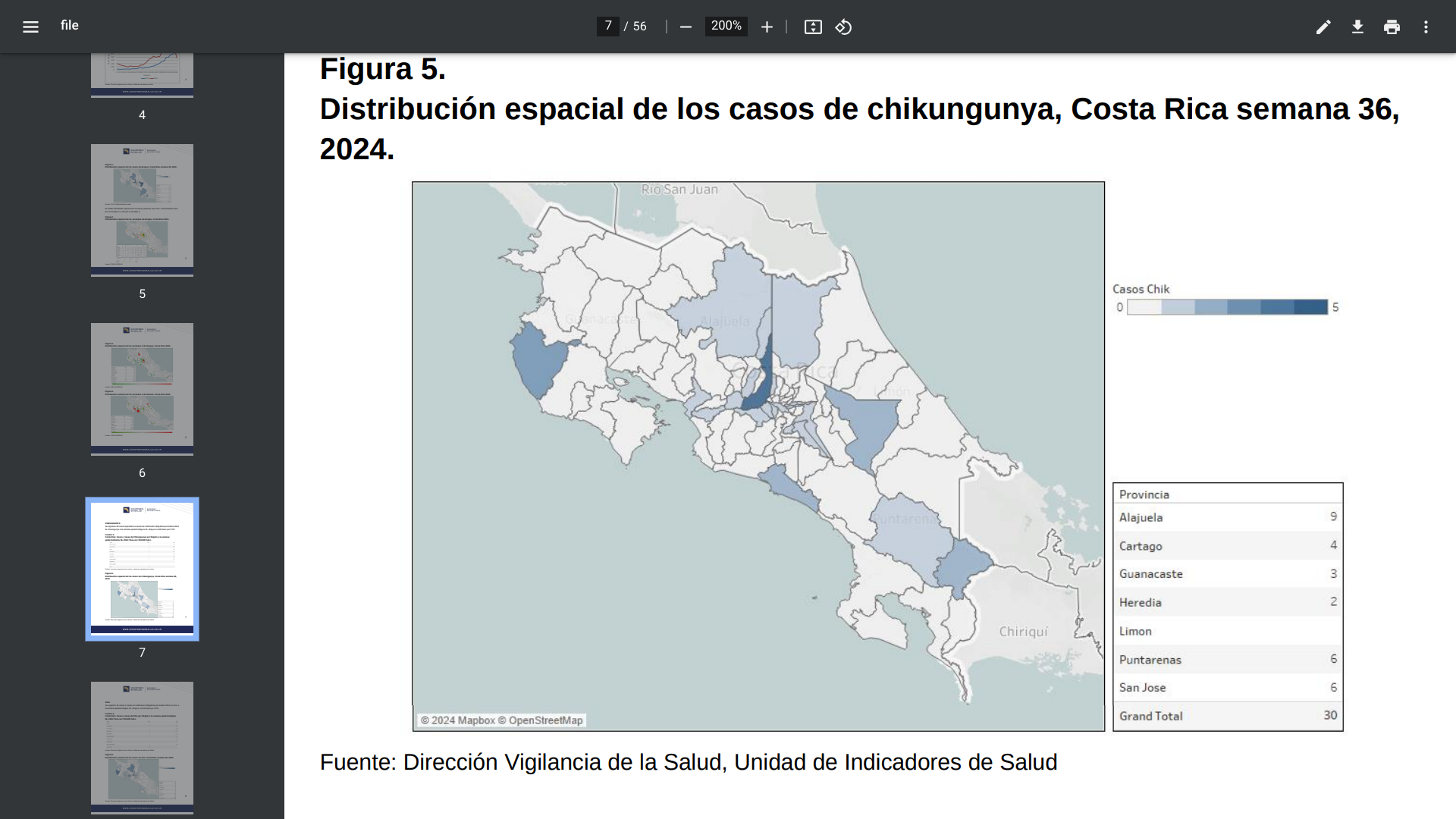 The Costa Rica Health Department's Boletín Epidemiológico N°36 was posted on September 20, 2024. It confirms that mosquito-transmitted Chikungunya, Dengue, Malaria, or Zika virus infections have occurred this year and vary by location.