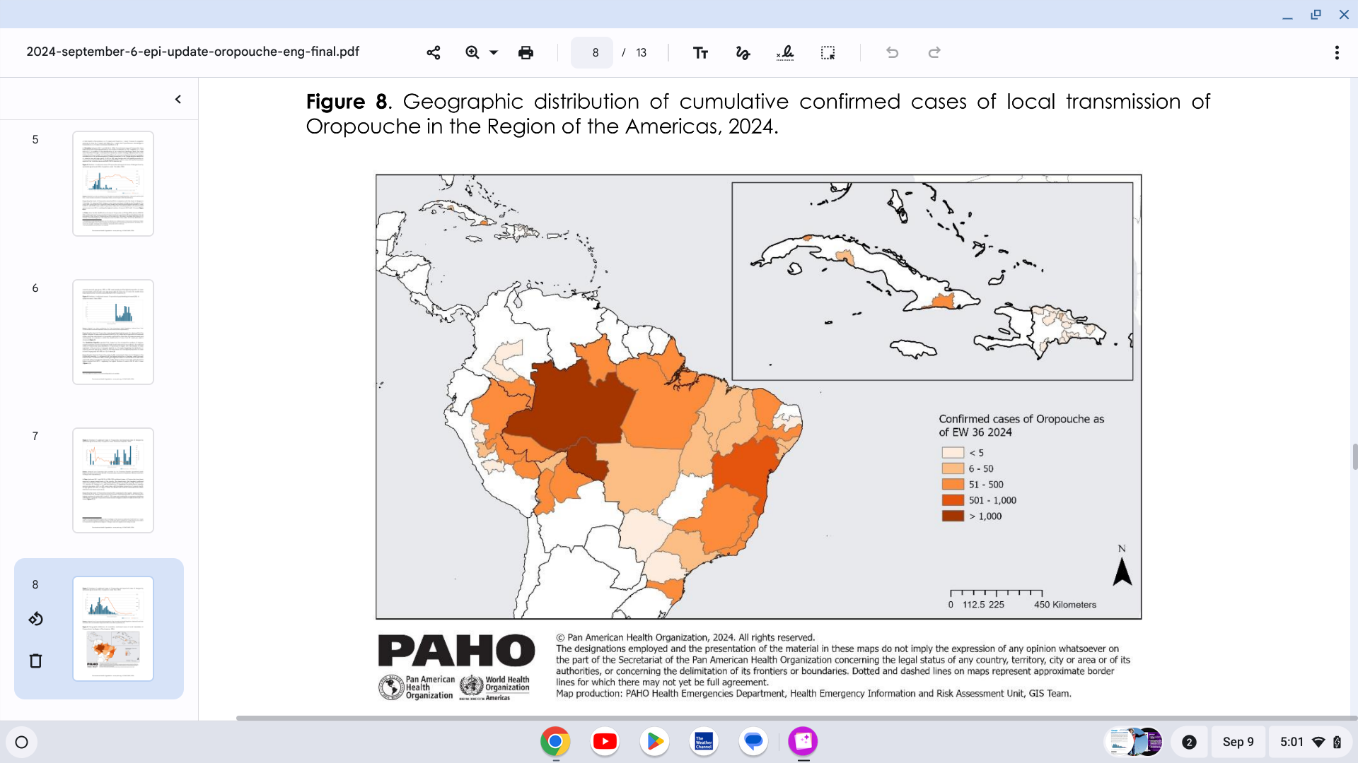 Confirmed cases were reported in eight countries: Bolivia (356), Brazil (7,931, including two deaths), Canada (1 imported case), Colombia (74), Cuba (506), the Dominican Republic (33), Peru (930 cases), and the United States (21 imported cases, in 3 states).